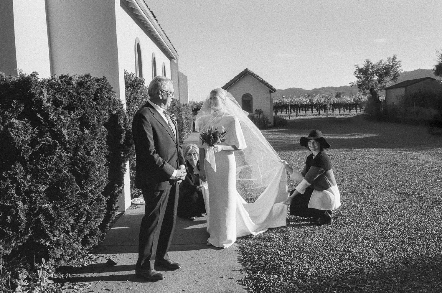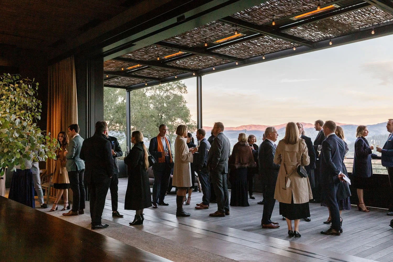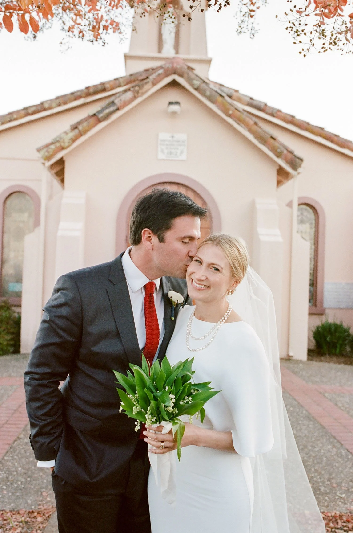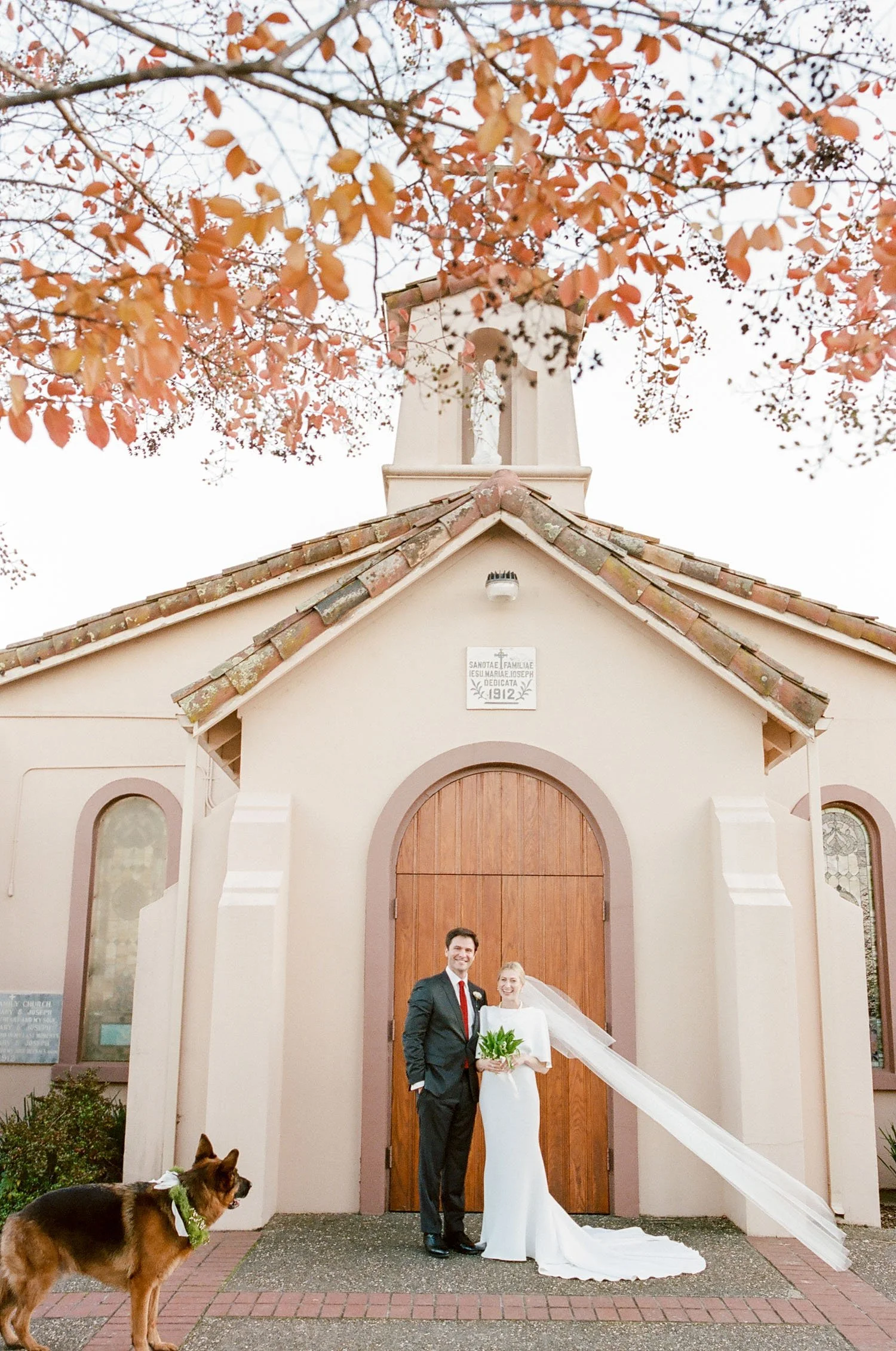 Still, Anne and Francois cherish every moment they spend with family, and it was important to them that their loved ones be present for the occasion. In late 2021, they were finally able to hold the larger gathering they had always imagined, with a Catholic ceremony in St. Helena followed by cocktails and a dinner reception at Promontory. The atmosphere was full of elegance and warmth, with an air of effortlessness that made everyone feel welcome. Anne wore a sheath gown with cape sleeves by Carly Cushnie, while Francois wore a grey suit accented by a red tie. The Charter Oak catered dinner, and Elan Artists kept everyone dancing long into the night. It was so incredible to see Anne and Francois finally get to celebrate with the ones they love, especially at a place that holds so much meaning for their personal history.