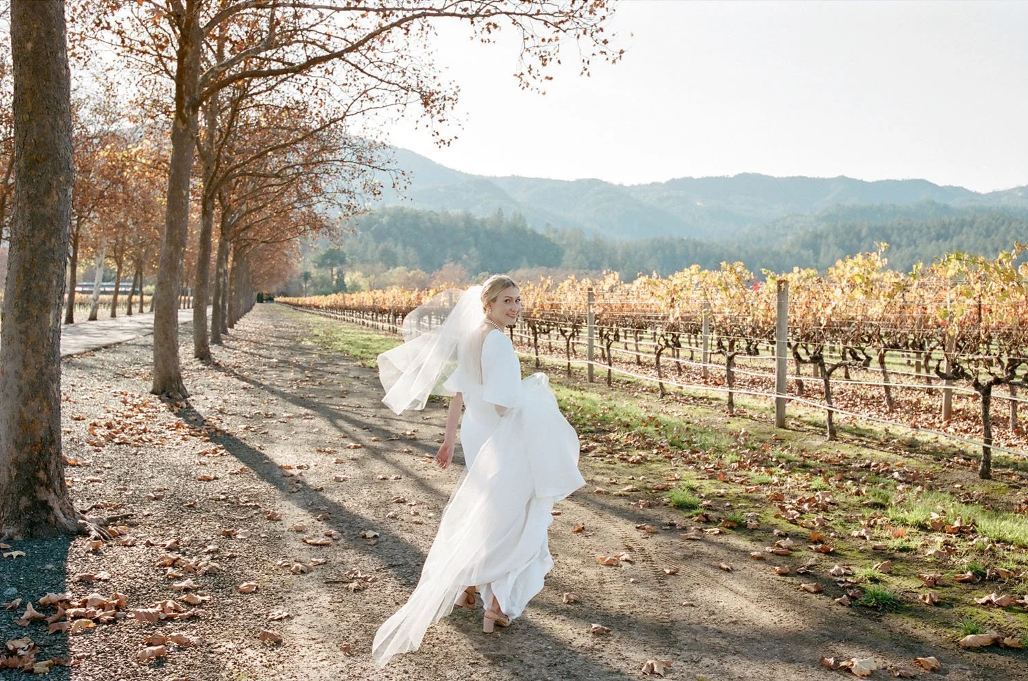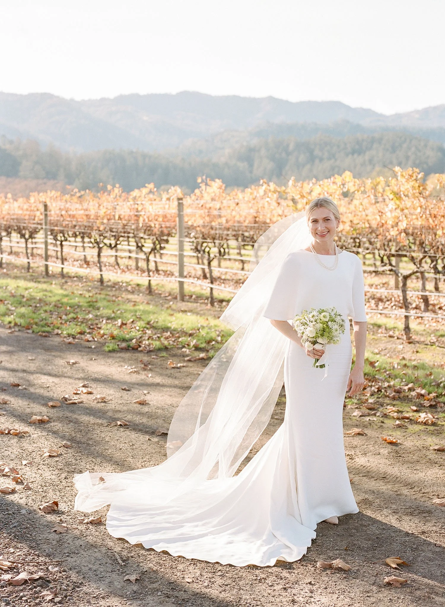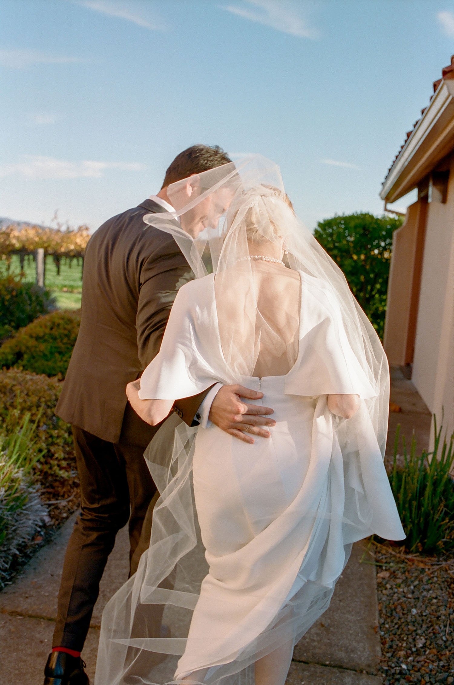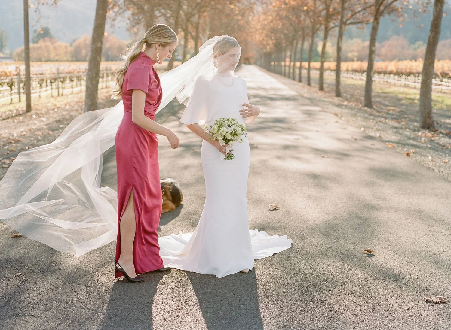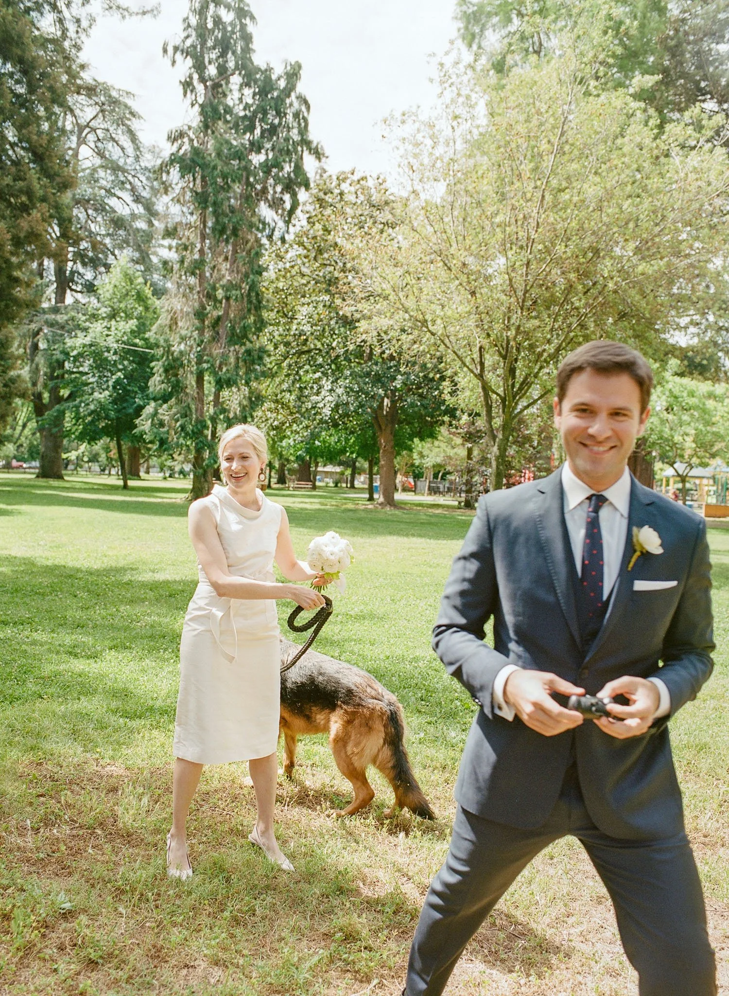 Though Francois hails from France and Anne is originally from the East Coast, their stories crossed when they both began working at the Promontory Estate Winery in Napa Valley. Promontory’s patchwork of vineyards, modern architecture, and endless canyon views are absolutely breathtaking, and their celebration was an incredible opportunity to share a place they love with their family and friends. Their day was also the culmination of more than a year of waiting. 2020 travel restrictions led Anne and Francois to marry in a small ceremony at a local park in Napa, with only a few close friends in attendance. Their dog, Crosby, was the center of attention, and Gott’s Roadside catered a picnic lunch. When Heidi from The Wedding Detailor got wind of Anne’s choice to marry instead of wait another year, she whipped up a short dress for her in less than a week. It was a simple, charming afternoon that felt just as meaningful as a grand affair.
